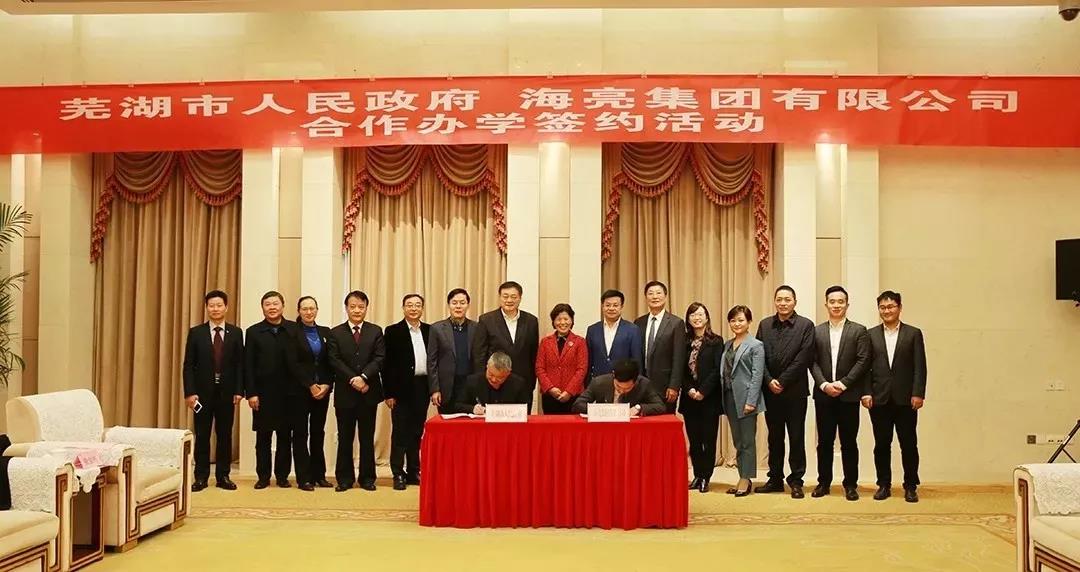 12月28日,海亮集團與蕪湖市人民政府合作辦學簽約儀式在蕪湖市舉行。蕪湖市長賀懋燮、副市長程剛、安徽省江北產業集中區管委會主任唐開強及有關部門負責人,海亮集團、教育管理集團、教育投資集團有關領導馮亞麗、陳軍偉、潘利民、辛穎等參加簽約儀式。